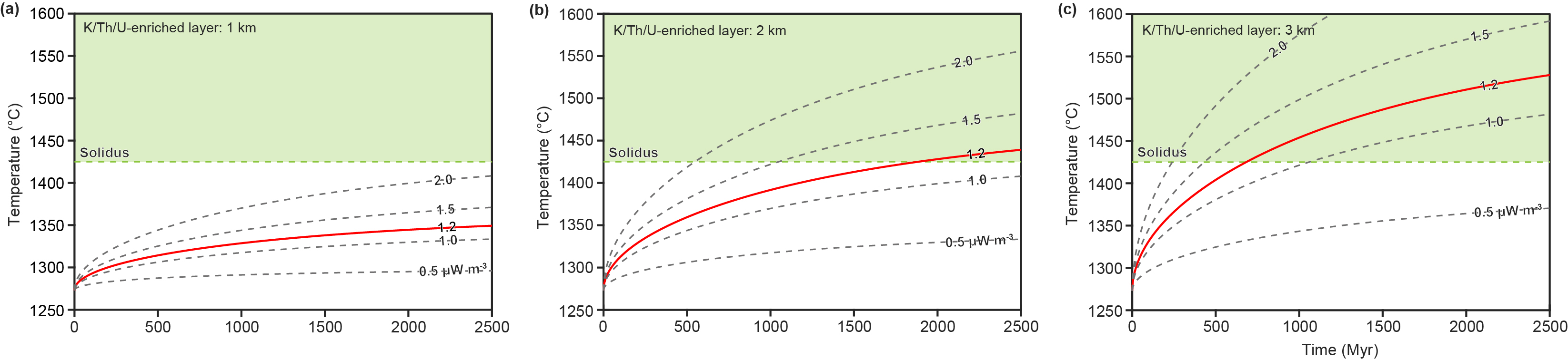 图4 放射性加热数值模拟结果。假设富集 K/Th/U (以嫦娥五号玄武岩成分作为输入参数)的基性岩浆层厚度分别为 1 km (a)、2 km (b) 和 3 km (c),埋藏于 200 km 深处;放射性热产率约为 1.21 μW·m⁻³(由其 K₂O 含量 0.15 wt%、Th 含量 5.1 ppm、U 含量 1.3 ppm 计算得出)。图中灰色虚线为不同热产率(0.5、1.0、1.5、2.0 μW·m⁻³)条件下的加热曲线,用于与红色曲线(1.21 μW·m⁻³)对比