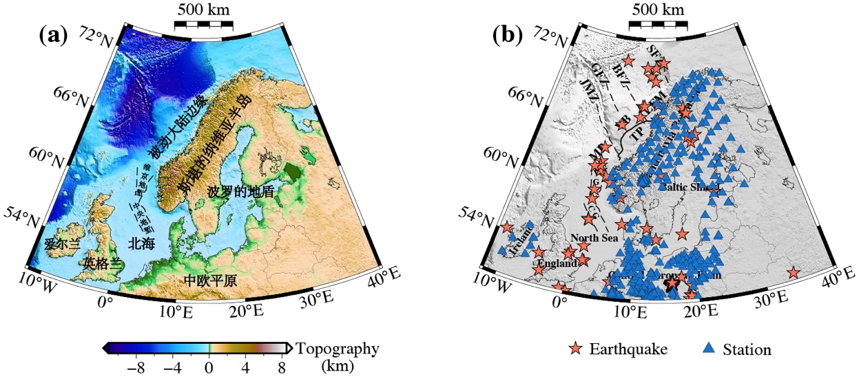 图1 (a) 波罗的地盾及其周边地区地表地形及 (b) 本研究所使用的的地震事件(红色五角星)与台站(蓝色三角形)分布。构造单元主要包括:VB:韦林盆地;LFM:罗弗敦-维斯特伦边缘;MB:莫尔盆地;TP:特伦德拉格平台;VG:维京地堑;CG:中央地堑;JMZ、GFZ、BFZ、SFZ:扬马延、Gleipne、Bivrost、Senja断裂带