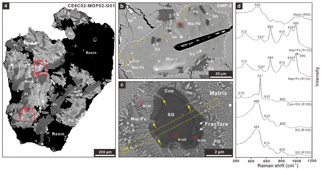 图1 含柯石英的月海玄武岩碎屑的岩相学特征和拉曼光谱。(a)月海玄武岩碎屑(MGP02,G01);(b)冲击熔融囊;(c)熔融囊中的二氧化硅碎屑,可见柯石英产出于二氧化硅碎屑边部;(d)熔融囊中各种矿物的拉曼光谱
