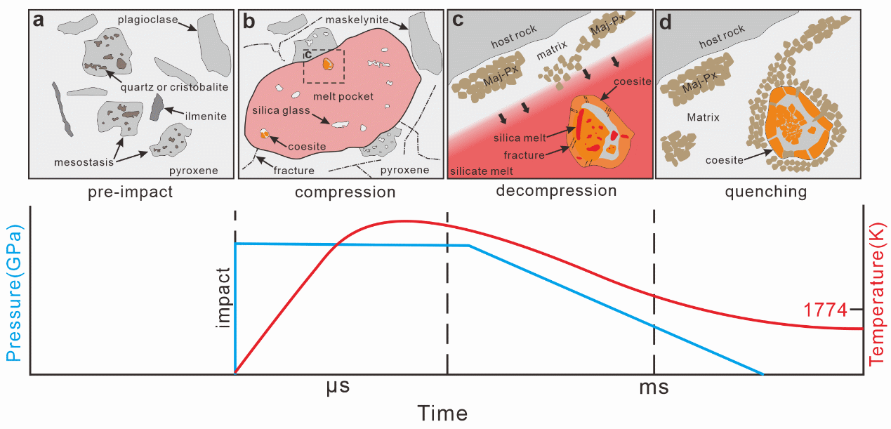 结合柯石英、熔长石、镁铝榴石等高压矿物的组合关系,他们限定了撞击事件的峰值温压条件,其中峰值压力约为24 GPa,峰值温度约为3000 K。基于发现的高压矿物,他们通过有限元热传导模拟估算冲击熔融囊冷却到柯石英形成并保存的时间约为4 ms(图3),并据此构建了完整的冲击压力-温度-冷却历史的轨迹,以及柯石英的形成机制(图4)。