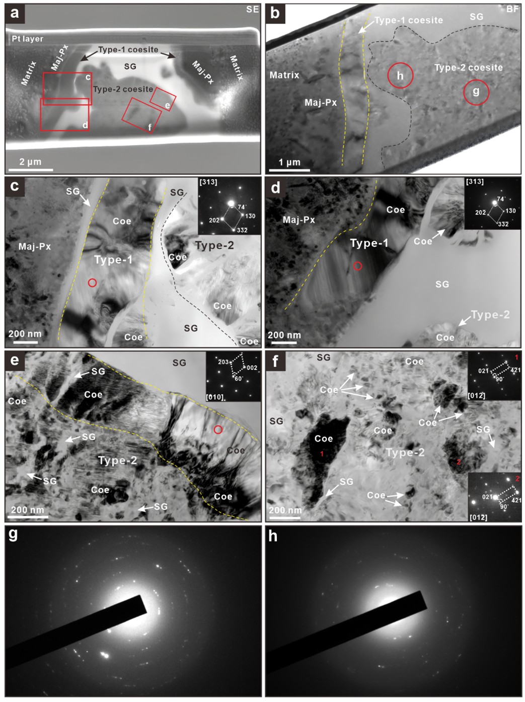 他们对含柯石英的二氧化硅颗粒进行了聚焦离子束(FIB)切片,并借助透射电镜分析和确定了高压矿物的微观结构和晶体学特征(图2)。结果发现,二氧化硅碎屑内部也存在柯石英(图2a-图2b),并且与边部环状柯石英在空间上表现出连续性(图2c-图2d)。这两种产状的柯石英均呈现他形结构,晶粒尺寸不一,以及相似的晶体取向(图2c-图2h),其中部分柯石英具有尖叶状结构(图2e),晶间可见二氧化硅玻璃相(图2e-图2f)。结合柯石英的岩相、微观结构与晶体取向,他们推测柯石英是由二氧化硅玻璃通过固-固相变形成,且部分柯石英在减压过程中回退为二氧化硅玻璃。