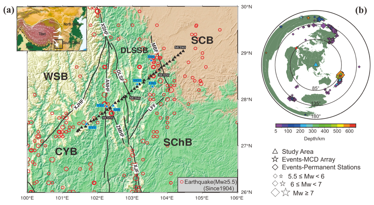 图1 青藏高原东南缘构造、地震、MCD 台阵与固定台站分布图。(a:藏东南主要构造、地震、台站信息,左上方插图中的黑色方框标示研究区域在青藏高原的位置;b: 研究工作中使用的地震事件信息)