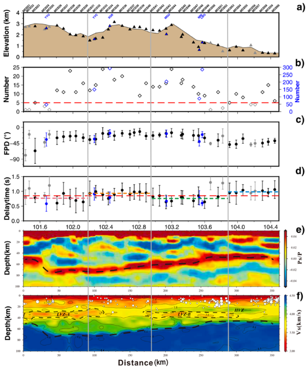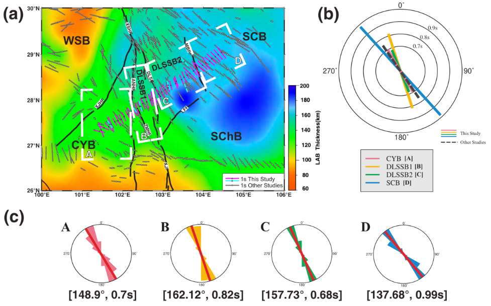 研究揭示藏东南地幔流对该区地震各向异性有一级的控制作用,此外,丛集的大型断裂带对该区地震各向异性有次一级的约束作用,说明大型断裂带对壳幔介质变形的显著影响。他们指出该区壳内虽然存在低速薄层,但XKS分裂参数对低速薄层的响应不明显。相反,受益与大型断裂带周缘的密集宽频带观测的分辨能力,断裂带在XKS分裂参数中的响应显著。即:快剪切波偏振方向在断裂带附近有中等程度的旋转;慢剪切波延迟时间在断裂带丛集区域有明显的增大,在远离断裂带丛集区域变小(图3,图4)。