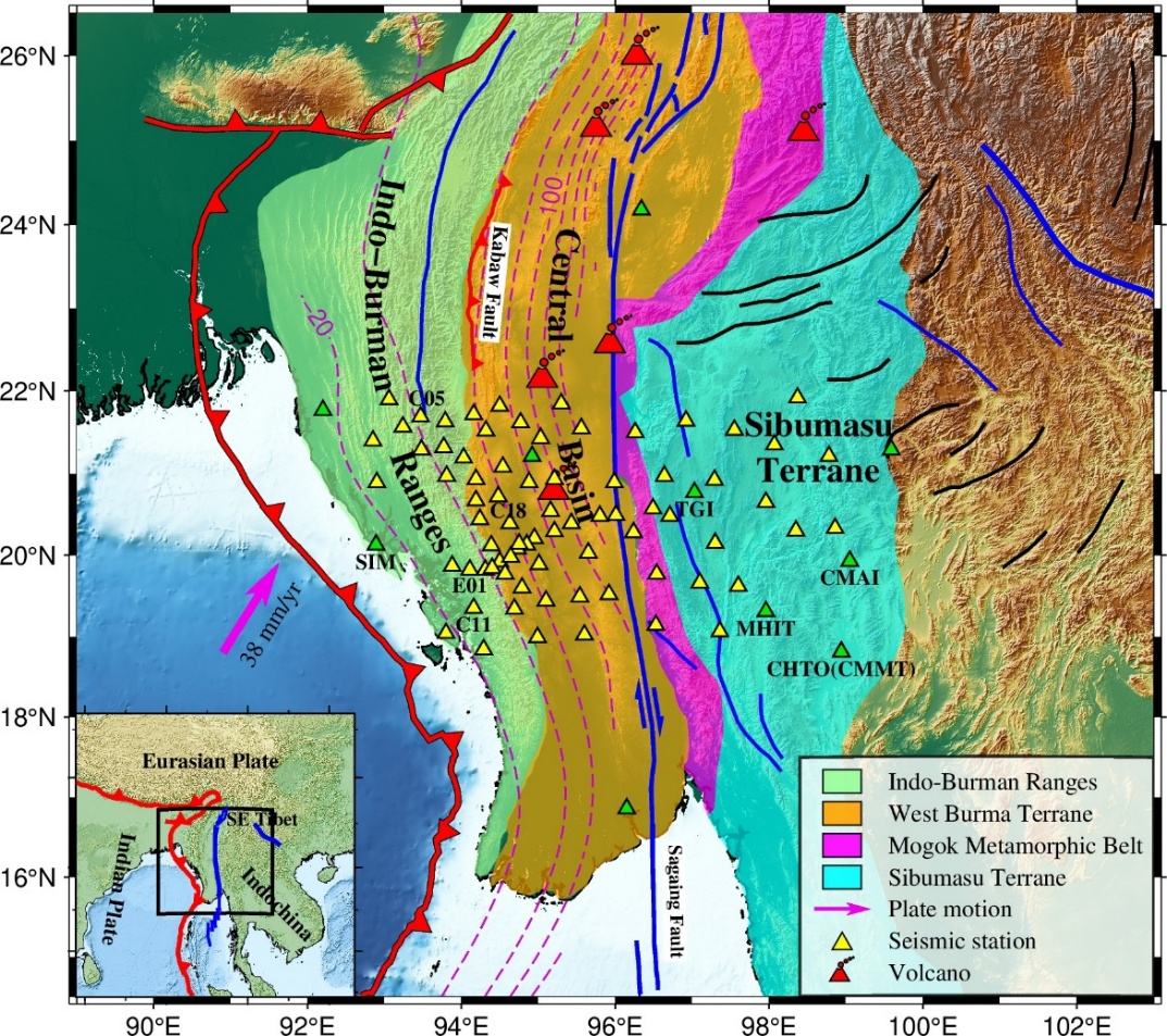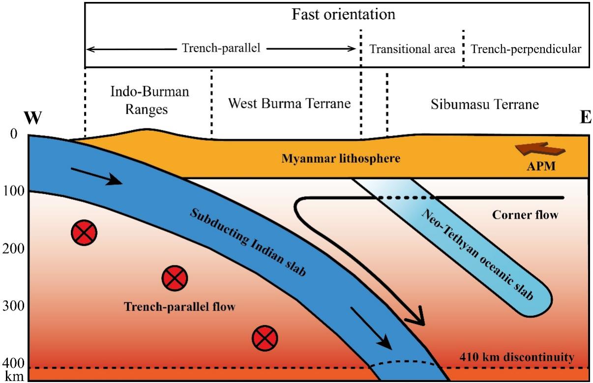 在板块俯冲过程中,岩石圈进入地幔会引起其自身及周围地壳和地幔物质发生显著变形。揭示俯冲带中地壳与地幔的变形模式,对理解板块俯冲动力学及其构造演化具有重要意义。缅甸位于印度板块与欧亚板块汇聚边界的东缘,地震定位与层析成像结果清晰显示了该区域下方东倾俯冲的印度板块,使该地区成为研究俯冲带壳幔变形与动力学机制的理想场所。