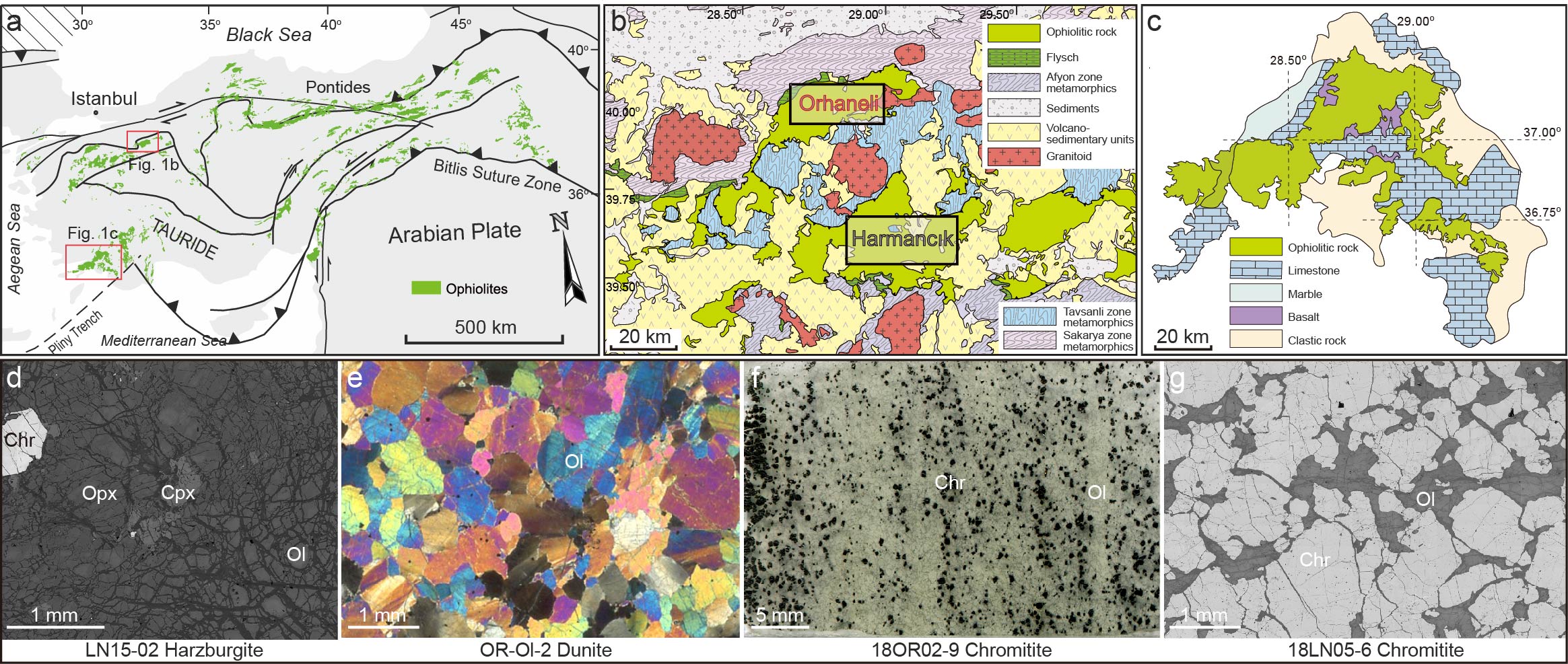 图1 土耳其蛇绿岩分布、Bursa和Lycian蛇绿岩地质简图及代表性样品岩石学特征