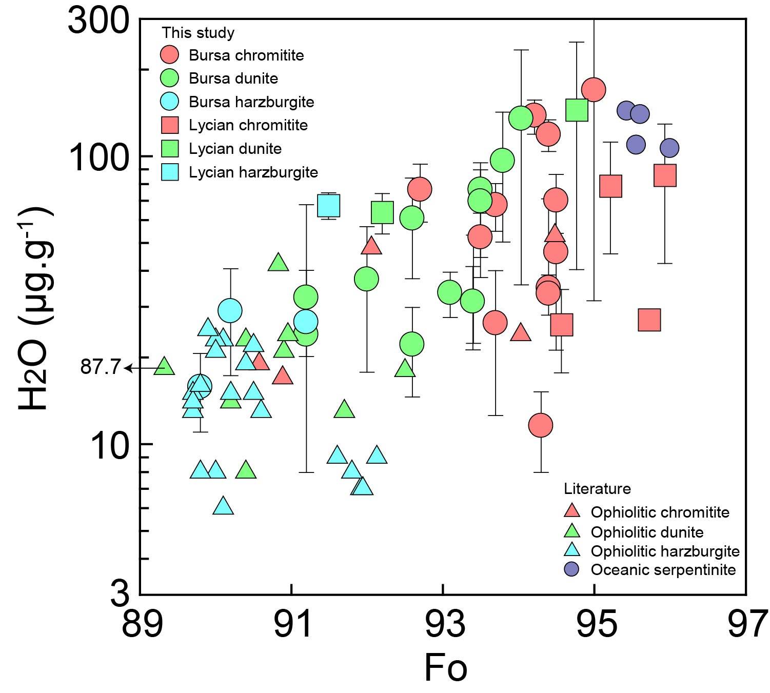 传统理论认为,部分熔融后的难熔型岩石圈地幔因挥发分丢失而极度贫水。然而,800彩票苏本勋研究员联合国内外学者,对土耳其Bursa和Lycian蛇绿岩的40件地幔样样品(图1)进行了橄榄石的水含量测试,发现橄榄石含水量变化范围为5-169ppm,与难熔指标橄榄石Fo值(90-96)呈显著正相关(图2)。通过全球其他蛇绿岩及地幔捕掳体的系统分析,揭示水含量与Fo值的正相关在岩石圈地幔的普遍存在,即越难熔的组分越富水(图3)。这一发现远超此前预期,完全不同于熔体抽取或岩浆分异导致的负相关模式(图3),挑战了岩石圈地幔“干”的经典模型,揭示了其作为地球深部重要水储库的关键角色。
