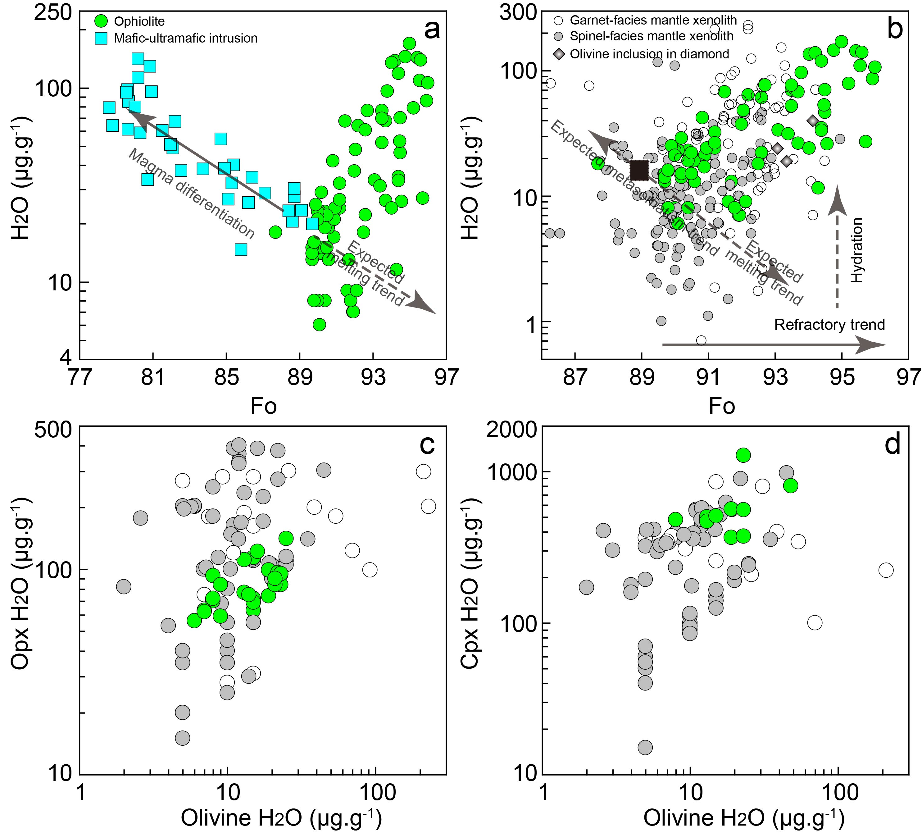 图3 蛇绿岩和地幔捕掳体与侵入岩中橄榄石的Fo值与水含量相关性对比,以及橄榄石与辉石的水含量相关性图解