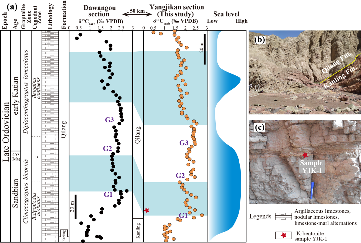 晚奥陶世是地质历史上一个关键的气候转折期,其环境变迁对全球生态系统和生物演化进程具有深远影响。广泛记录于该时期海相地层中的Guttenberg碳同位素正漂移(GICE)事件(偏移幅度可达~3‰),是研究晚奥陶世气候变化的重要载体。然而,受全球古生物地理区系分异及区域性环境差异的影响,GICE事件的触发机制至今尚未形成统一认识。