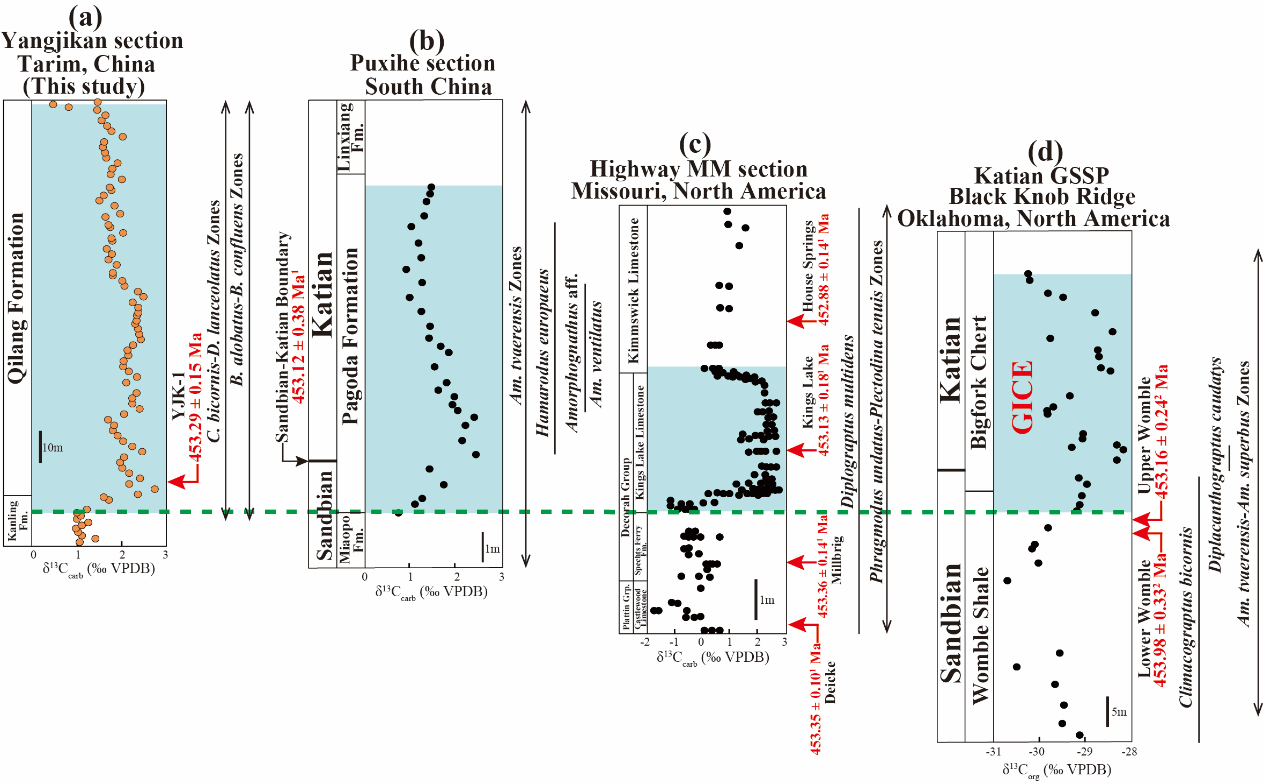 现有共识认为GICE主要由有机碳埋藏增加所驱动,但其初始诱因存在多种假说,如海平面上升、全球变冷和大规模火山活动等。另一个争议点在于GICE的持续时间:北美克拉通约为40万年,华南扬子地区长达82万年,塔里木盆地更达到120万年。建立高精度年代地层框架是解决以上争议的关键,既可验证GICE的全球同时性,又能为探究其触发机制提供精确的年代学约束。