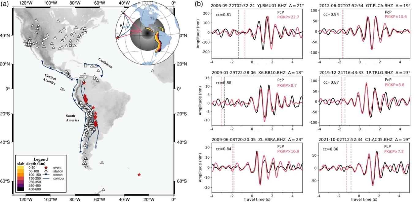 图1 台站、事件和波形对比图。(a)台站(白色三角形)、地震事件(红色五角星)和三个主要的俯冲带:中美洲、南美洲和加勒比地区。插图显示了直达P波、外核反射震相PcP波和内核反射震相PKiKP波的射线路径和俯冲带的俯冲深度。(b)PcP(黑色)与PKiKP(红色)波形比较。六组高质量的PcP和PKiKP波形以拾取到时为中心,其理论到时分别用黑色和红色虚线标出