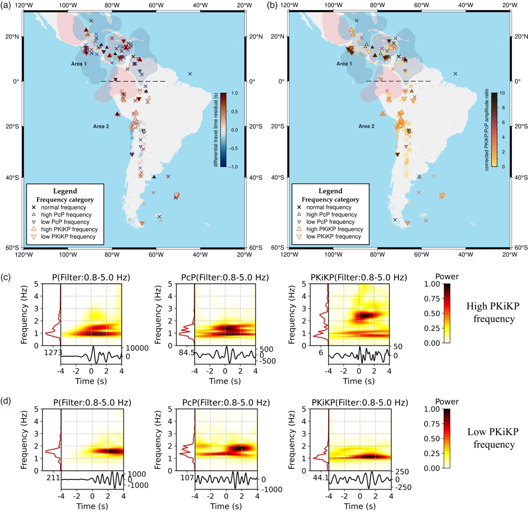 矫正后的走时残差与振幅比结果显示,中美洲及加勒比地区的结构特征较为复杂且不确定性较大,这可能与多尺度下地幔不均匀性有关,其影响难以完全排除,因此难以有效解析该区域CMB与ICB的结构变化。相比之下,南美洲的结果呈现出更稳定的分布模式。频谱特征显示,在南纬0