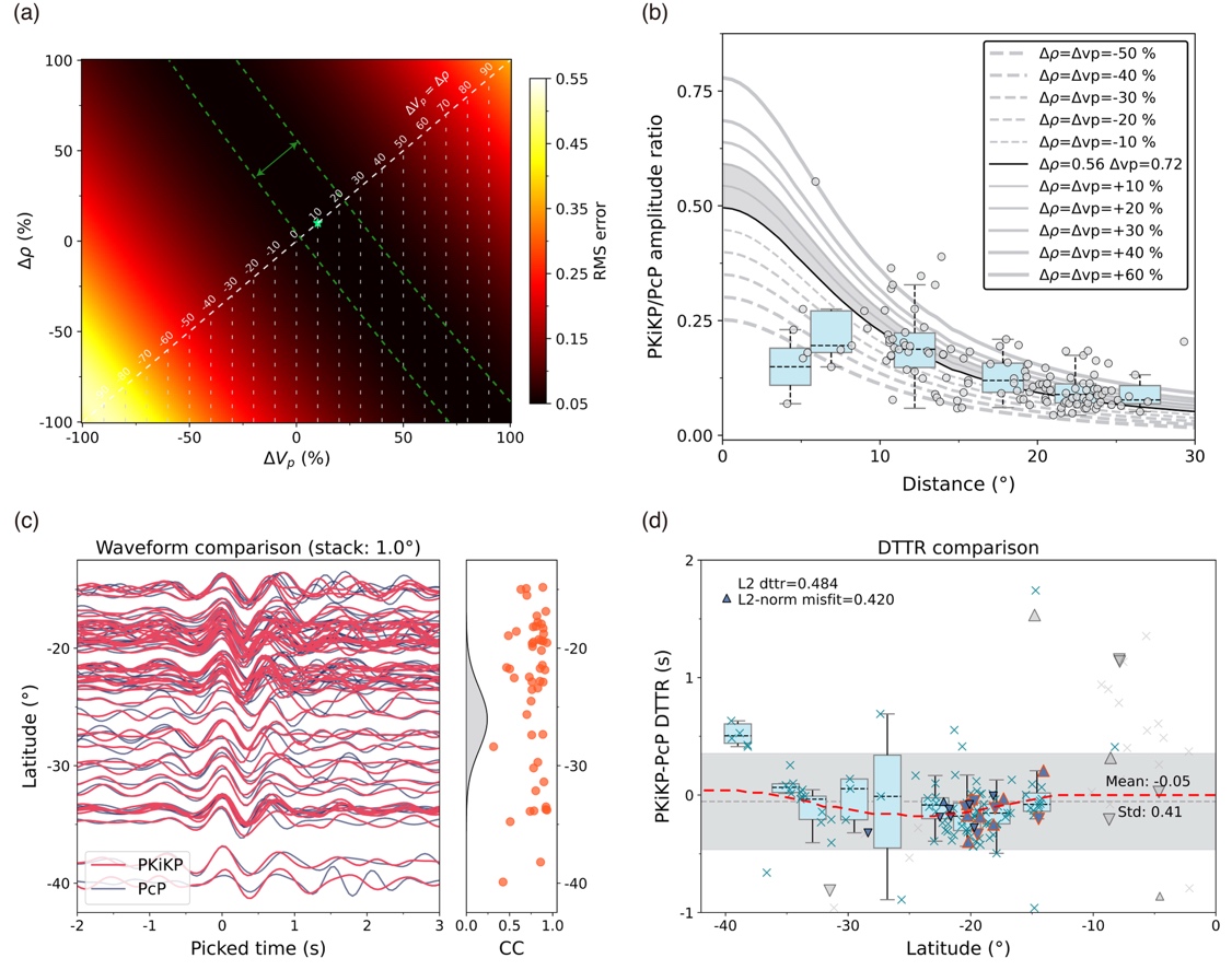 Vp)最佳模型范围搜索;(b)按照相同比例的密度和P波速度跳变扰动的理论振幅比与实际观测值对比图;(c)叠加后的PcP与PKiKP波形相似性随纬度分布图;(d)PKiKP-PcP走时残差随纬度分布图