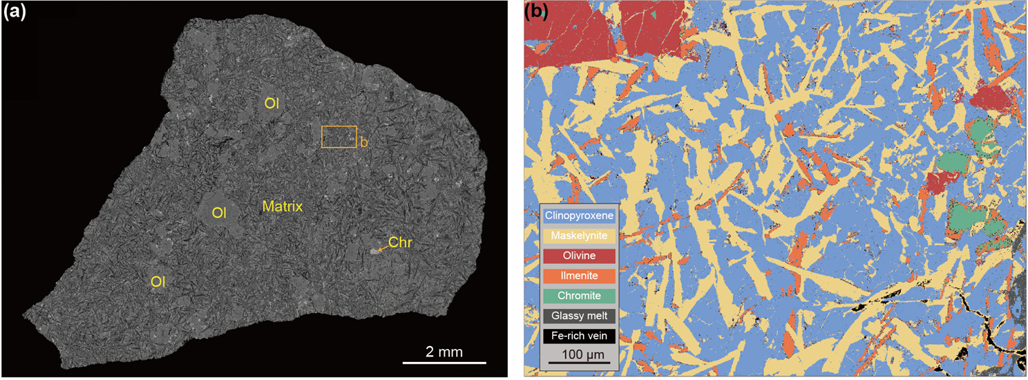 图1 NWA 16286的岩相学特征。该陨石呈现斑状结构,斑晶为较为自形的橄榄石,基质主要由细粒的橄榄石、细板条状熔长石和环带较为明显的单斜辉石组成。副矿物相包括针状钛铁矿,高钛铬铁矿以及钛铁尖晶石