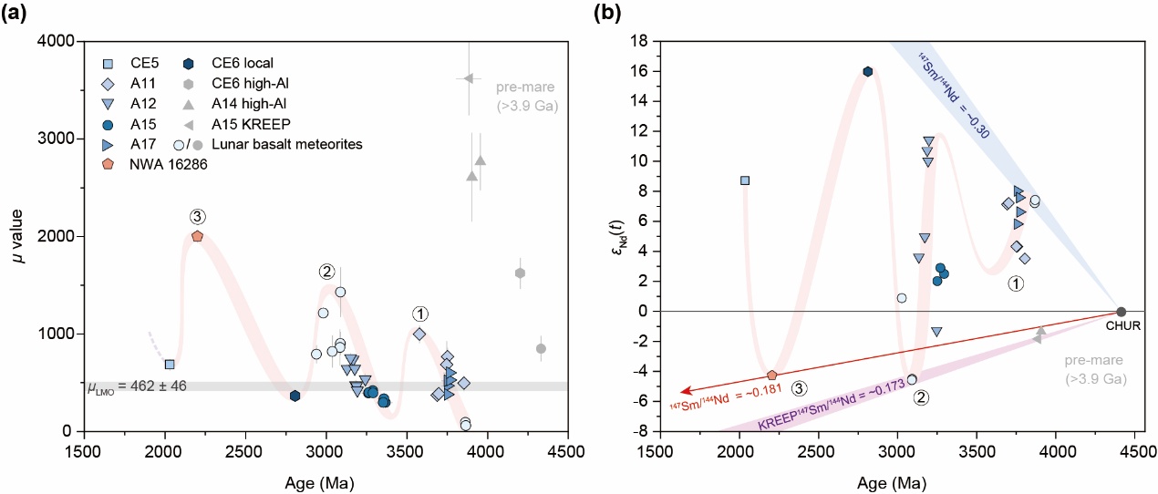 更令人惊讶的是,该陨石的月幔源区表现出异常的地球化学特征:其238U/204Pb高达 2000,远超大多数月海玄武岩(通常为60–1000);同时其εNd(t) 值低至 –4.3,与典型KREEP玄武岩源区非常接近。这些特征明确表明,该玄武岩源自一个富集KREEP组分的月幔源区。这一发现将月球KREEP相关的火山活动的存续期延长了约 8亿年,续写了月球“热引擎”的功能。