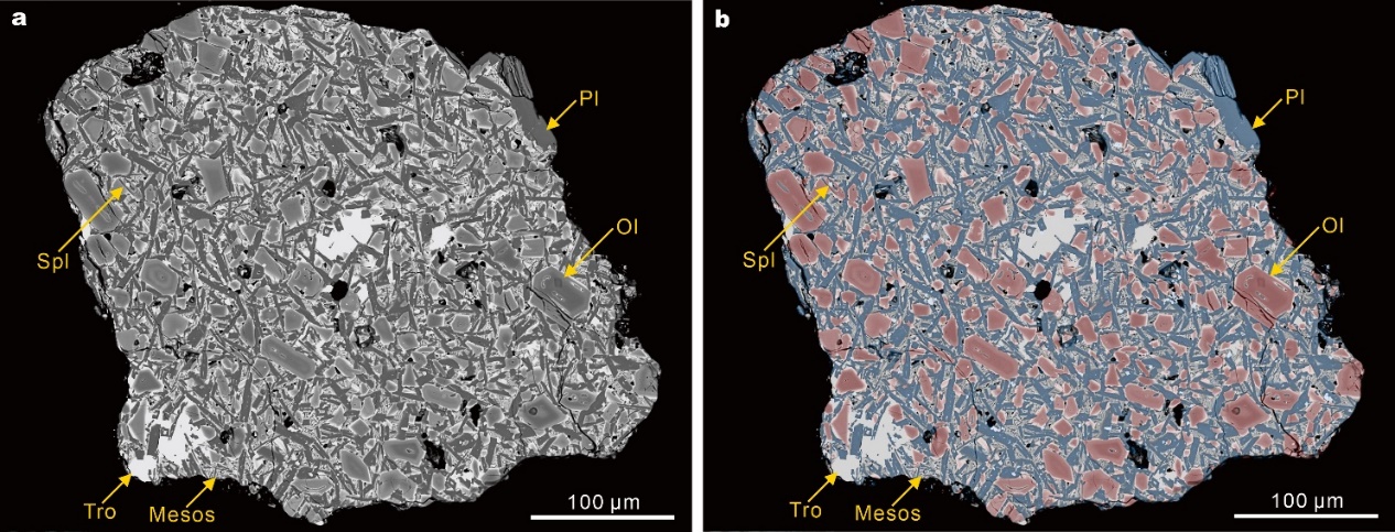 图1 嫦娥六号样品中含尖晶石的橄长质岩屑。(a)背散射图片;(b)能谱扫描图片。图b中红色和蓝色深浅分别对应镁元素和铝元素的浓度高低。Spl:尖晶石;Ol:橄榄石;Pl:斜长石;Tro:陨硫铁;Mesos:末期充填物