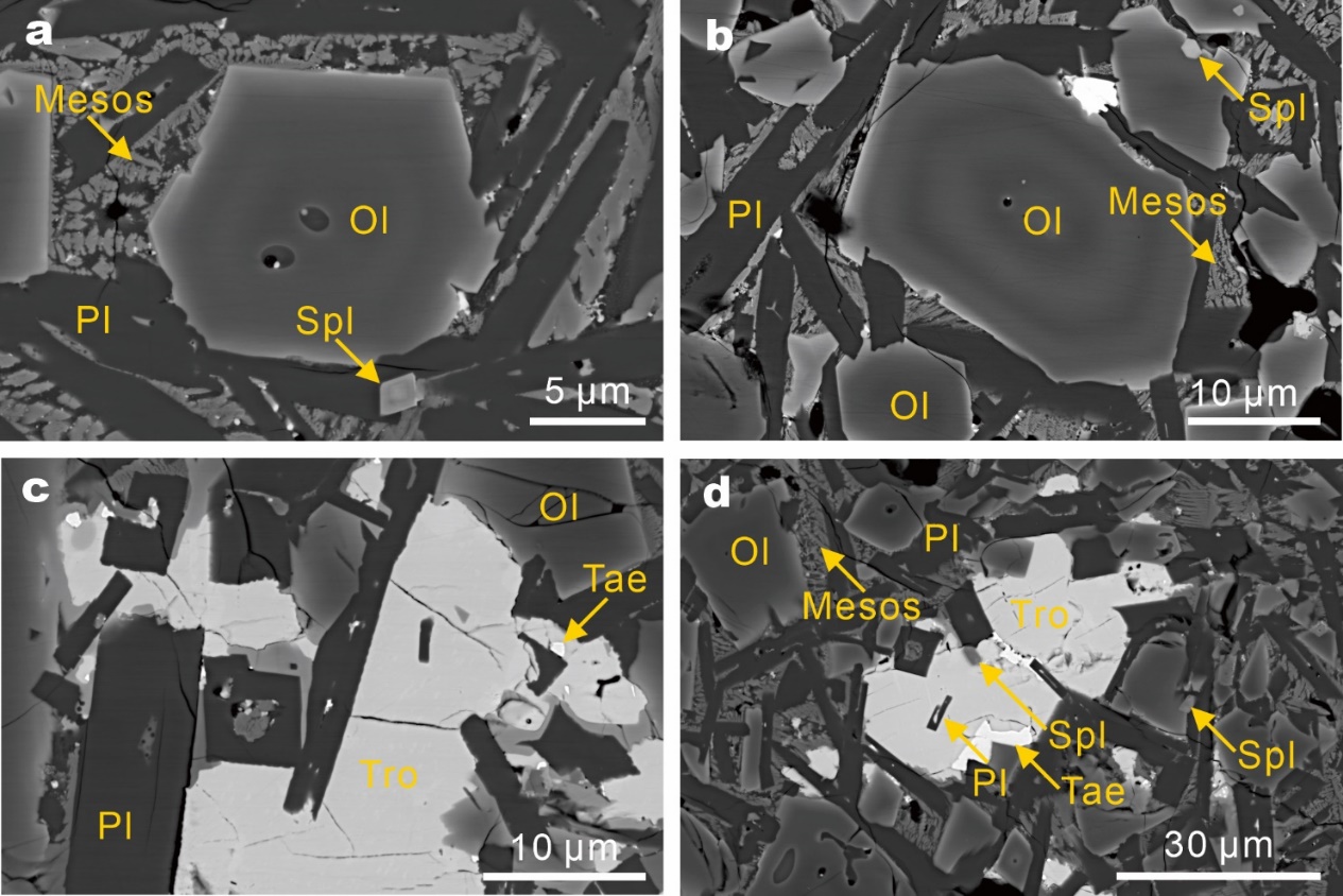 图2 含尖晶石橄长质岩屑的岩相特征。(a)含有熔体包裹体的正环带橄榄石;(b)具有振荡环带的橄榄石;(c-d)岩屑中的陨硫铁和铁镍金属。Spl:尖晶石;Ol:橄榄石;Pl:斜长石;Tro:陨硫铁;Mesos:末期充填物;Tae:镍纹石