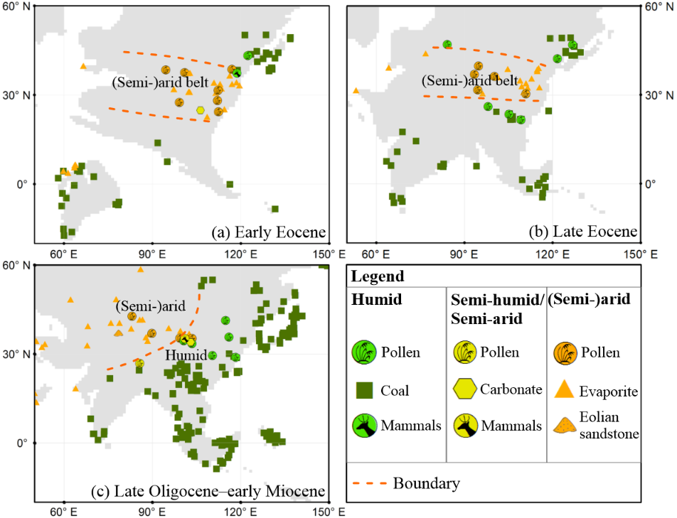 图1 基于地质记录重建的(a)早始新世、(b)晚始新世与(c)晚渐新世-早中新世的东亚气候格局(灰色底图为新重建的早始新世、晚始新世与早中新世海陆分布图)