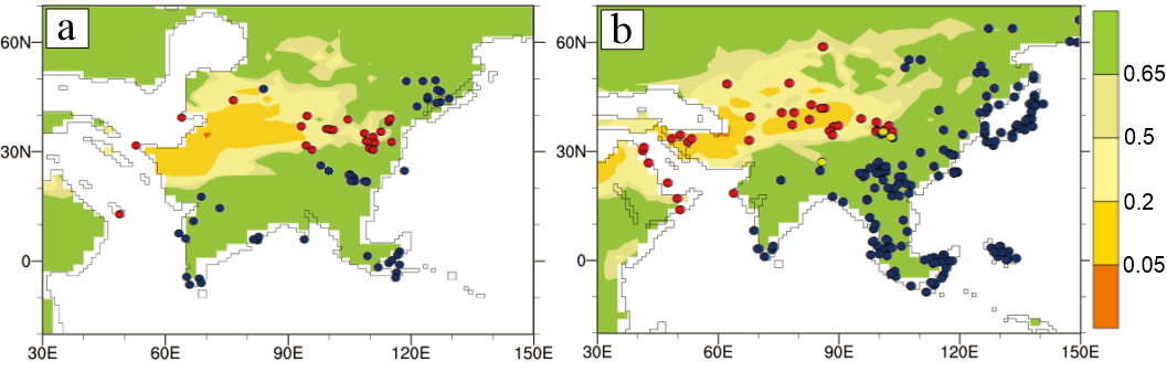 图3 基于模拟结果计算的(a)晚始新世实验(LEOC)和(b)早中新世实验(EMIO)的干旱指数(AI)。AI值低于/高于0.65的地区被认为是干旱/湿润区,AI值越低表示越干旱。蓝色、黄色和红色圆点分别代表湿润、半湿润/半干旱和干旱环境