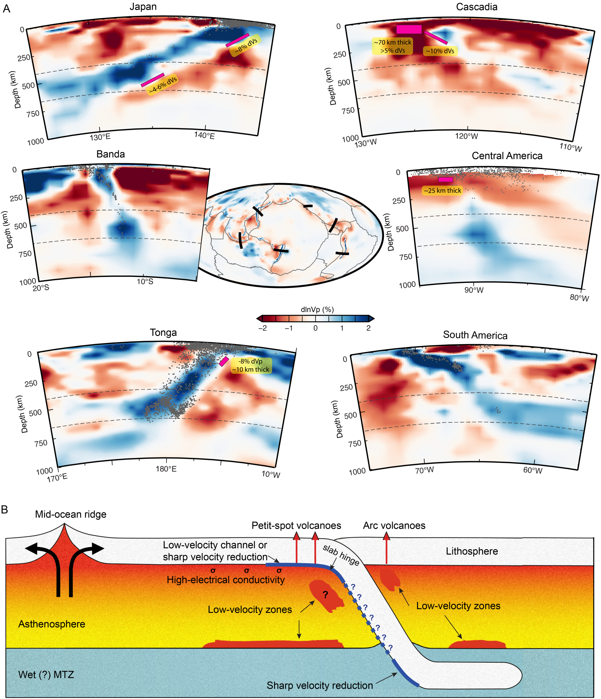 图1 地震学观测揭示全球不同俯冲板片下方的LVZs及卡通示意图