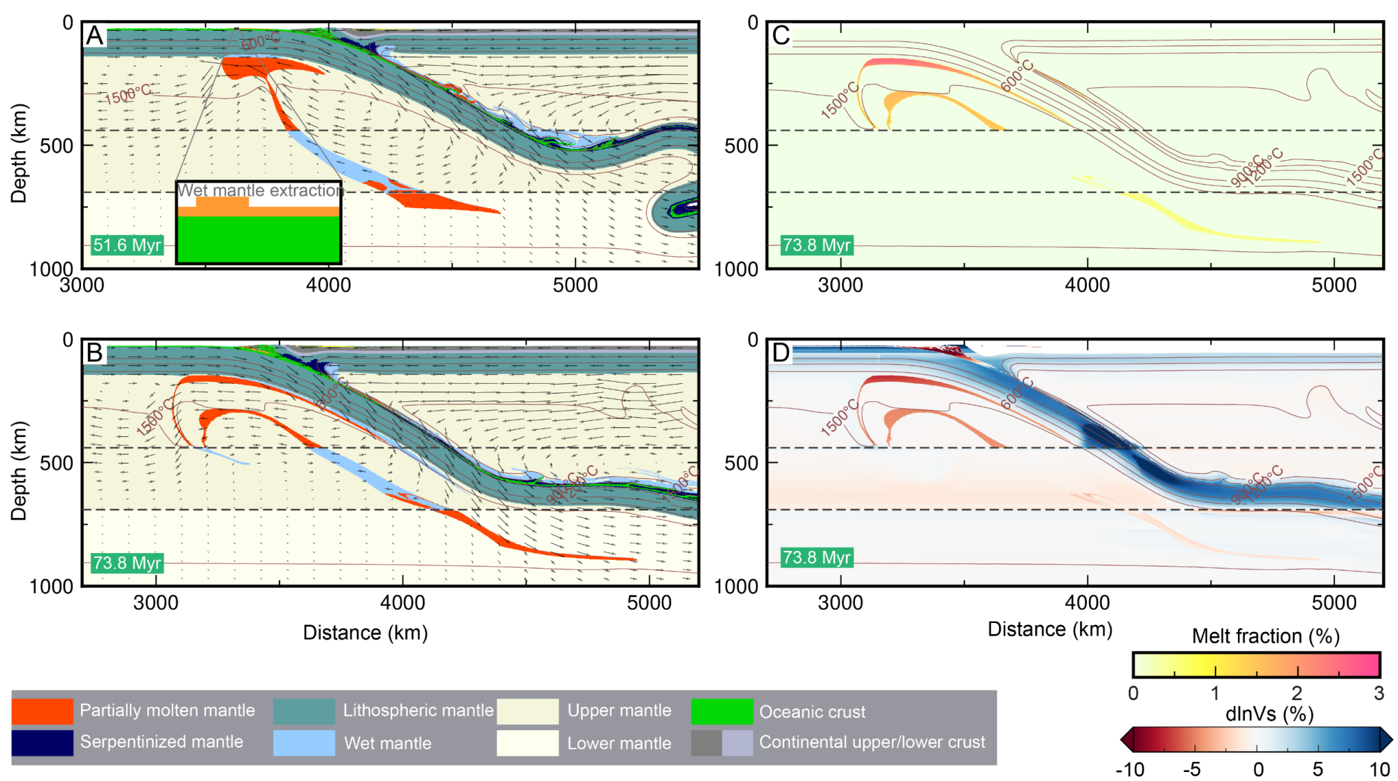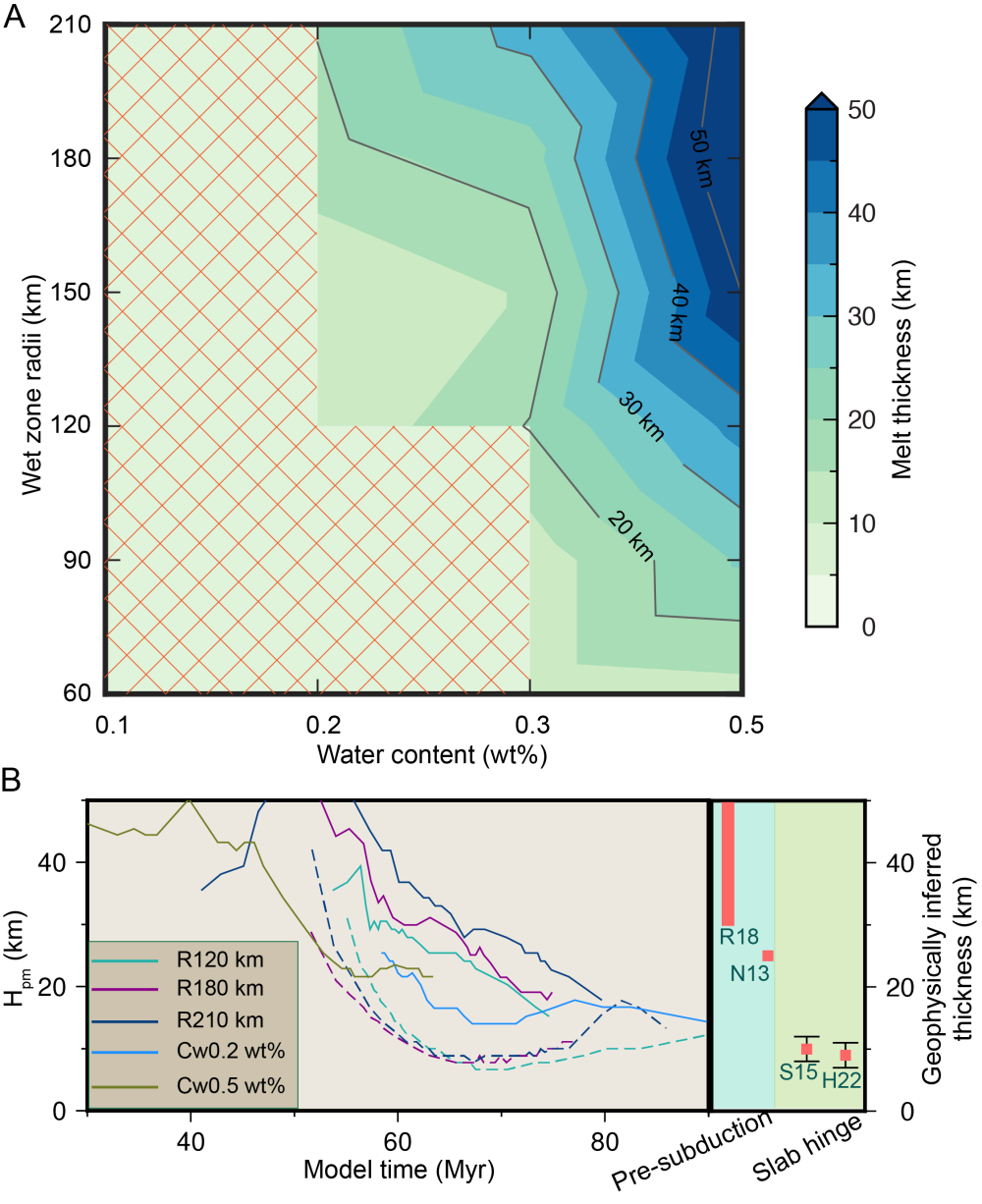 地幔转换带(MTZ)是一个具有巨大储水能力的区域。研究表明,MTZ局部含水量可达0.3wt.%以上。研究团队通过高分辨率的地球动力学数值模型,发现俯冲板块驱动的粘性拖曳流,将含水MTZ物质上涌至上地幔并引发脱水熔融。这种熔融过程在岩石圈底部形成了局部熔融区域,即我们观测到的LVZs(图2)。