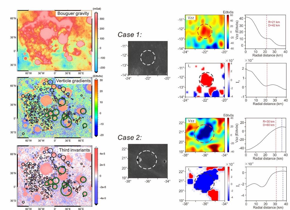 月球撞击坑是研究太阳系撞击历史的天然实验室。撞击产生的物理与化学作用,例如破坏原生月壳与物性分层、撞击后月幔松弛效应、撞击熔融与化学分异等,是了解撞击时间与撞击体尺寸、月球内部圈层多尺度结构的重要对象 (Chen et al., 2024; Wan et al., 2025; Xu et al., 2024)。然而,由于月海岩浆活动(Mare flooding)与后期撞击活动的覆盖作用等,古老表面撞击坑统计仍是个开放性问题,进而制约了月球早期撞击通量模型的建立。由于隐伏撞击坑内部的高密度火山玄武岩填充物和周围低密度的斜长质月壳之间存在密度差,并在空间上呈现类“牛眼”形状,因此可以通过重力异常与重力梯度分析进行有效识别。美国GRAIL (Gravity Recovery and Interior Laboratory)任务获取的月球高精度重力场模型,为进一步识别和恢复隐伏撞击坑提供了数据优势。