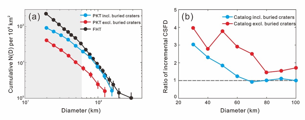 图2 风暴洋区域(Procellarum KREEP Terrane, PKT)撞击坑尺寸-频率分布统计结果(左),高地区域(Feldspathic Highlands Terrane, FHT)和月海区域撞击坑尺寸-频率分布增量比率(右)。图中蓝色和红色曲线分别代表包含和不包含隐伏撞击坑数据目录的统计结果