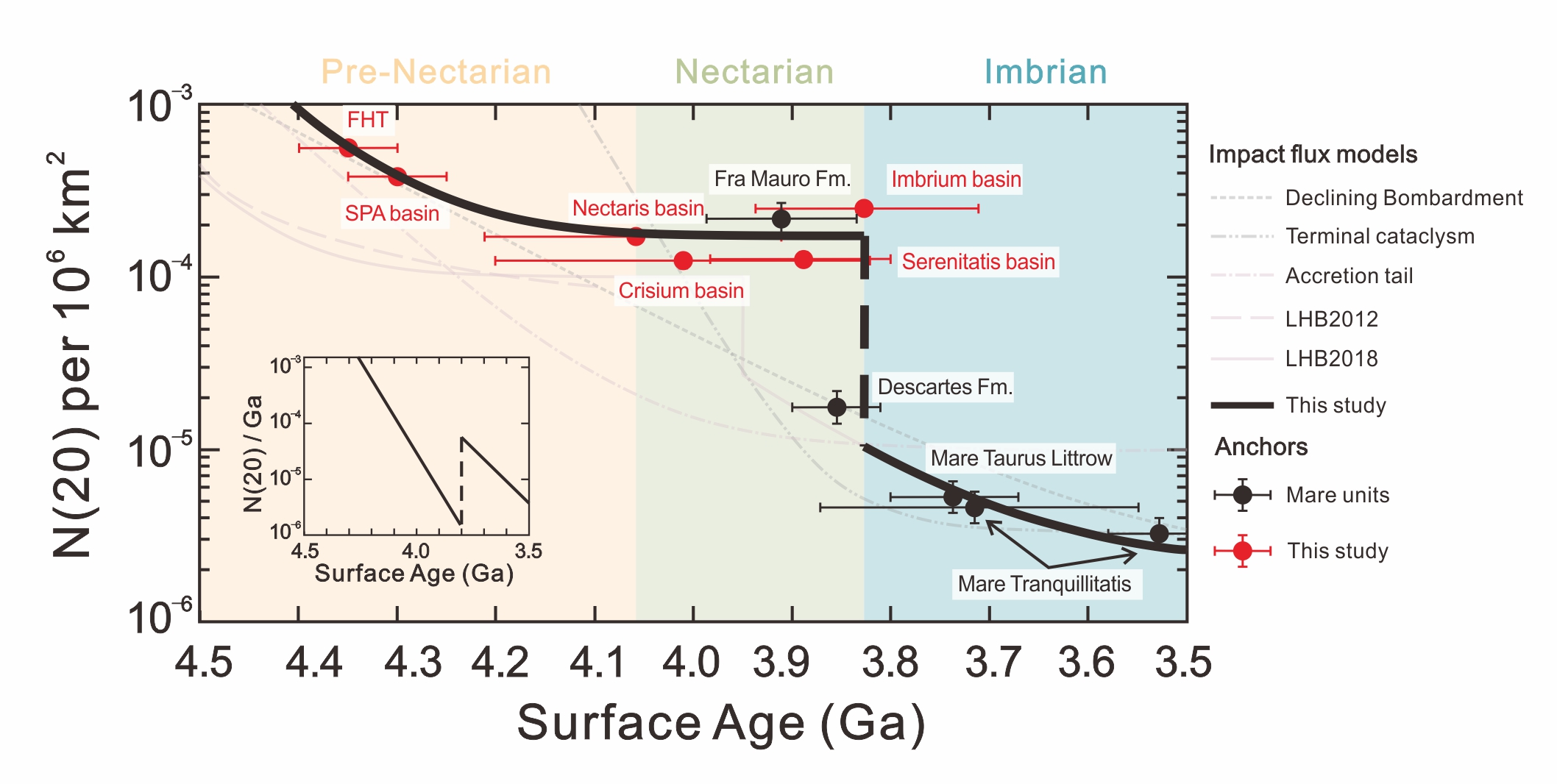 通过收集已发表的大型撞击盆地同位素定年的研究结果,研究人员建立了45~35亿年期间的N(20)—表面年龄关系曲线,称为撞击通量模型(图3)。利用撞击坑产率函数,可以将所有已发表的撞击通量模型换算至N(20),对比发现最新的N(20)估计结果与前人的模型之间差距较大,主要差异在于相对于年轻的表面,比Imbrium盆地更老的盆地或地体具有更高的撞击坑密度。这种差异无法用衰减模型解释,因此使用大灾变模型进行拟合,揭示了月球在Imbrium撞击事件前后经历了一次撞击高峰期。