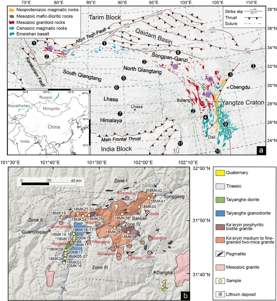 针对上述问题,800彩票岩石圈演化与环境演变全国重点实验室胡方泱特聘副研究员和吴福元院士与亚利桑那大学Mihai N. Ducea教授、德克萨斯大学James B. Chapman副教授、成都理工大学杨雷副教授、河海大学陈国辉副研究员以及中国地质科学院矿产资源研究所郭春丽研究员等合作,对我国松潘-甘孜带内的可尔因-太阳河岩体开展了系统的岩石学和地球化学研究,并统计分析了全球主要锂成矿伟晶岩与高温变质作用的时空分布特征,探讨了花岗质岩石的锂富集过程及其与地温梯度之间的成因联系。可尔因-太阳河岩体位于松潘-甘孜带的东部(图1)。其中,可尔因岩体的周围分布有多个锂辉石伟晶岩矿床/点,包括著名的李家沟锂矿和加达锂矿等,预估锂资源量达到300万吨以上。同期的太阳河岩体紧邻可尔因岩体,但是具有与可尔因岩体显著不同的成分特征。如此时空紧密联系却成分显著差异的两个岩体为探讨锂成矿相关岩浆的早期演化及地壳物理状态提供了良好的研究对象。