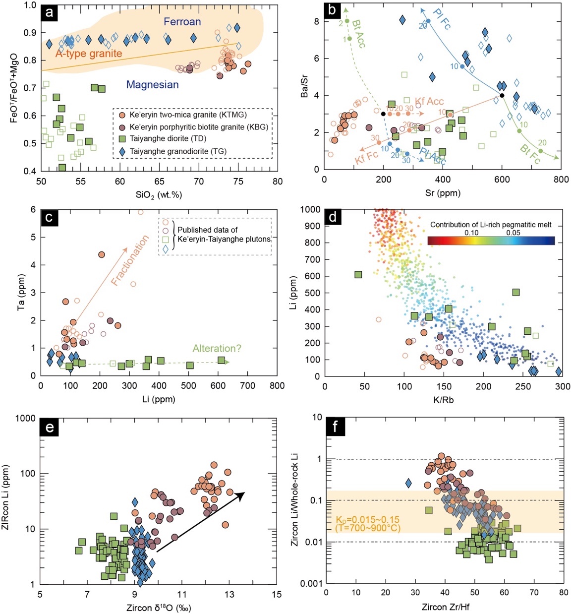 图2 全岩和锆石元素和同位素特征. (a)全岩SiO2 vs. 全岩FeOT/FeOT+MgO;(b)全岩Sr vs. 全岩Ba/Sr;(c)全岩Li vs. 全岩Ta;(d)全岩K/Rb vs. 全岩Li;(e)锆石18O vs. 锆石Li;(f)锆石Zr/Hf vs. 锆石Li/全岩Li