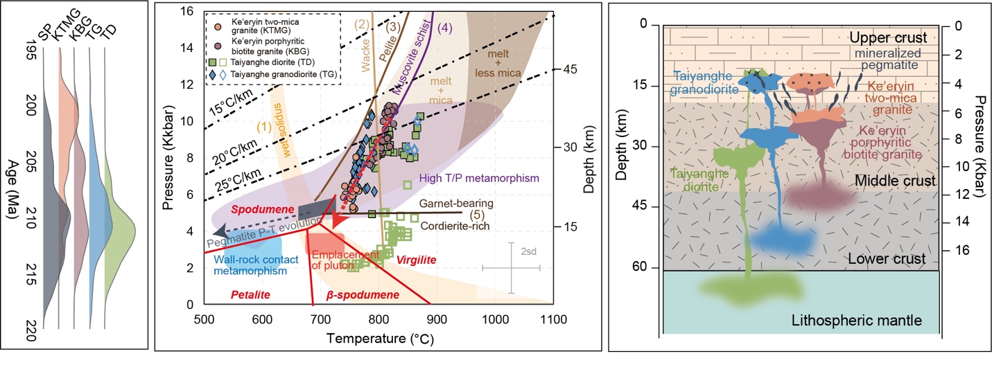 图3 可尔因-太阳河岩体与锂辉石伟晶岩的年龄概率密度图、温压条件和地壳剖面示意图