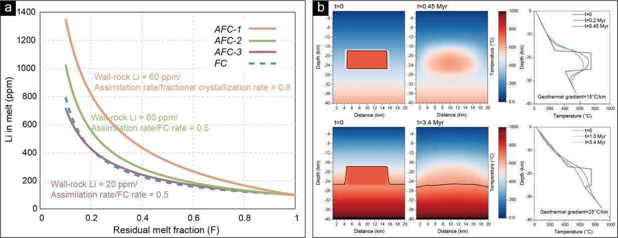 图4 地球化学模拟与热模拟分析. (a)分离结晶和围岩混染过程对岩浆锂富集的影响;(b)地温梯度对岩浆结晶历史的影响