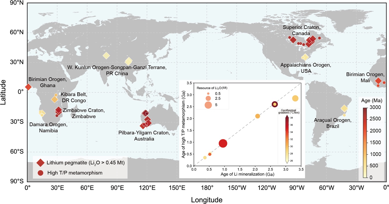 目前,对于锂辉石伟晶岩的成因,有三种主要观点,分别是变质沉积岩低程度部分熔融、花岗质岩浆的高程度结晶分异和多阶段部分熔融过程等。这些模型普遍注重于岩石的化学演化过程,但是对于锂成矿的地壳物理条件,却普遍缺少限定。根据观察事实来看,目前开采利用的锂辉石伟晶岩主要形成于太古代时期,而太古代时期地壳的成熟度相对较低,S型花岗岩相对较少,这表明变质沉积岩源区与锂成矿不是简单的正相关关系。另一方面,锂辉石伟晶岩普遍侵入于中级变质岩中,未发生变质作用的岩石通常不是锂辉石伟晶岩的围岩,而太古代时期的典型特征是具有较高的地温梯度。这些事实表明,地壳温度/地温梯度可能是影响岩浆中锂富集成矿的一个关键因素。