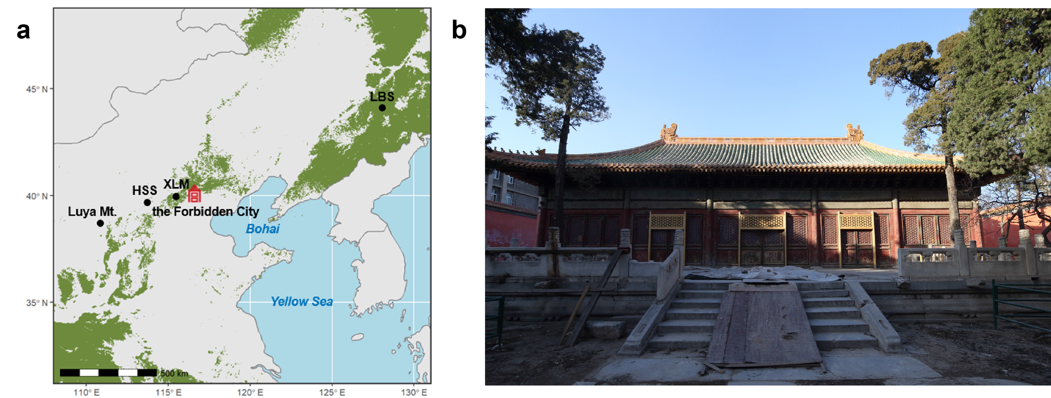 图1 采样地点(故宫)以及参考树轮氧同位素年表中国东北老白山(LBS)、北京周边(XLM)、恒山(HSS)和芦芽山(Luya Mt.)的位置(a)以及大高玄殿建筑群内九天应元雷坛殿的外观(b)