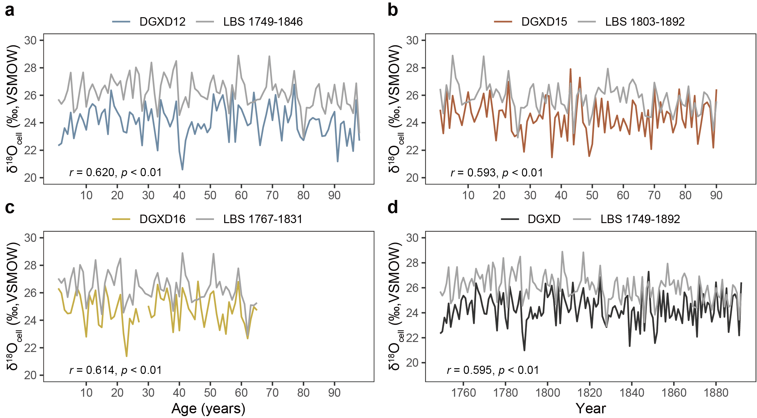 图2 大高玄殿3处木构件树轮氧同位素序列与东北老白山主年表在最佳匹配时段的对比(a-c)以及木构件拼接复合浮动年表与主年表对比(d)