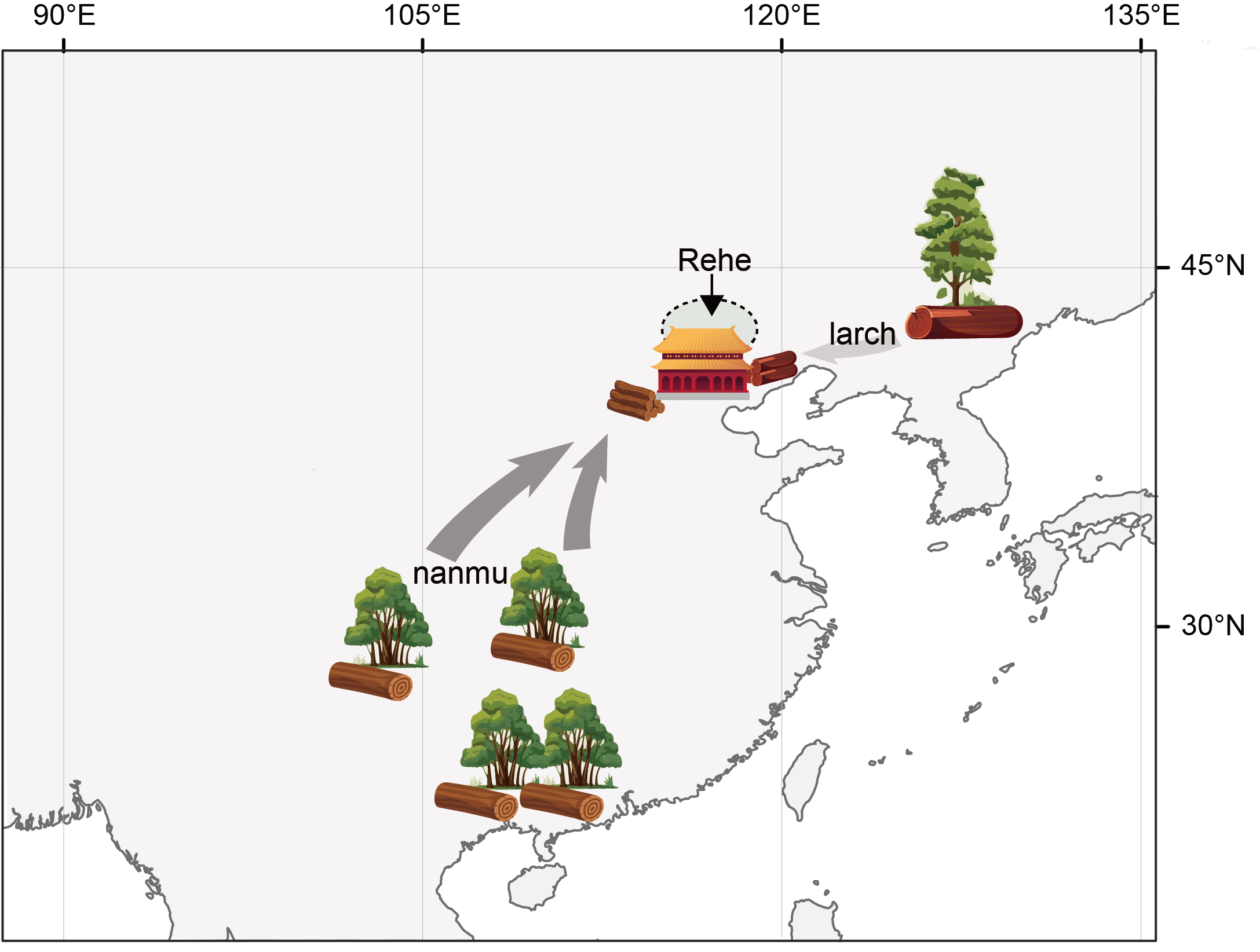 基于树轮氧同位素年代学获得的大高玄殿木构件的年代和产地来源均与历史文献记载相符。木构件最晚年代(1892年)与大高玄殿在清晚期被西方列强侵占并损坏,后于1902年两宫回銮后重建雷坛殿屋顶结构的记载能够对应;其产地来源也与清廷自康熙朝开始采办塞外松木代替楠木建造宫殿的历史记载相一致。换言之,对大高玄殿建筑群松木木材产地的成功溯源也进一步证实了明朝到清朝故宫古建筑用材策略的变化,即从楠木转变为松木(图3)。这一转变当是由于明朝两个多世纪以来不可持续的伐木导致楠木资源几近枯竭,最终楠木不敷使用,清廷开始寻找替代材料,其着眼点便是满族人所熟悉的“塞外松木”。