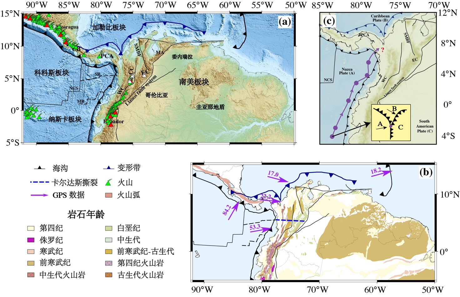 图1 哥伦比亚及邻近区域地表地形、主要构造和地质特征分布。 (a) 图中灰色线为海岸线,黑色线为主要的断层和洋脊分布 (Veloza et al. 2012),带三角形的蓝色和黑色实线表示了此区域的变形带和俯冲带,蓝色虚线标志着卡尔达斯撕裂位置 (C. A. Vargas & Mann, 2013),地表火山有三种类型,分别以不同颜色的三角符号表示:休眠火山(白色三角形)、1百万年以来的活火山(绿色三角形)和2023年仍有喷发记录的火山(红色三角形)(Venzke, 2023)。主图右上角为研究区域在全球地图上的展示; (b) 显示了区域构造简图,左侧为对应图例,紫色箭头表示纳斯卡板块、科科斯板块和加勒比板块相对于稳定的南美板块的 GPS 运动速度矢量(mm/年),相应的速度矢量值被标在箭头上方 (Jarrin et al., 2023; Mora-Paez et al., 2019);(c) 纳斯卡-加勒比-南美板块三联点(紫色圆圈)的类型及其随地质年代的迁移轨迹。图中主要构造名称缩写如下:WC:西科迪勒拉山系;CC:中科迪勒拉山系;EC:东科迪勒拉山系;SMBF:圣玛尔塔-布卡拉曼加断层;MA:梅里达安第斯山脉;巴拿马-乔科弧:巴拿马-乔科弧;CB:乔罗特加地体;NCS:纳斯卡-科科斯扩张中心;SR:桑德拉洋脊;MR:马尔佩罗洋脊