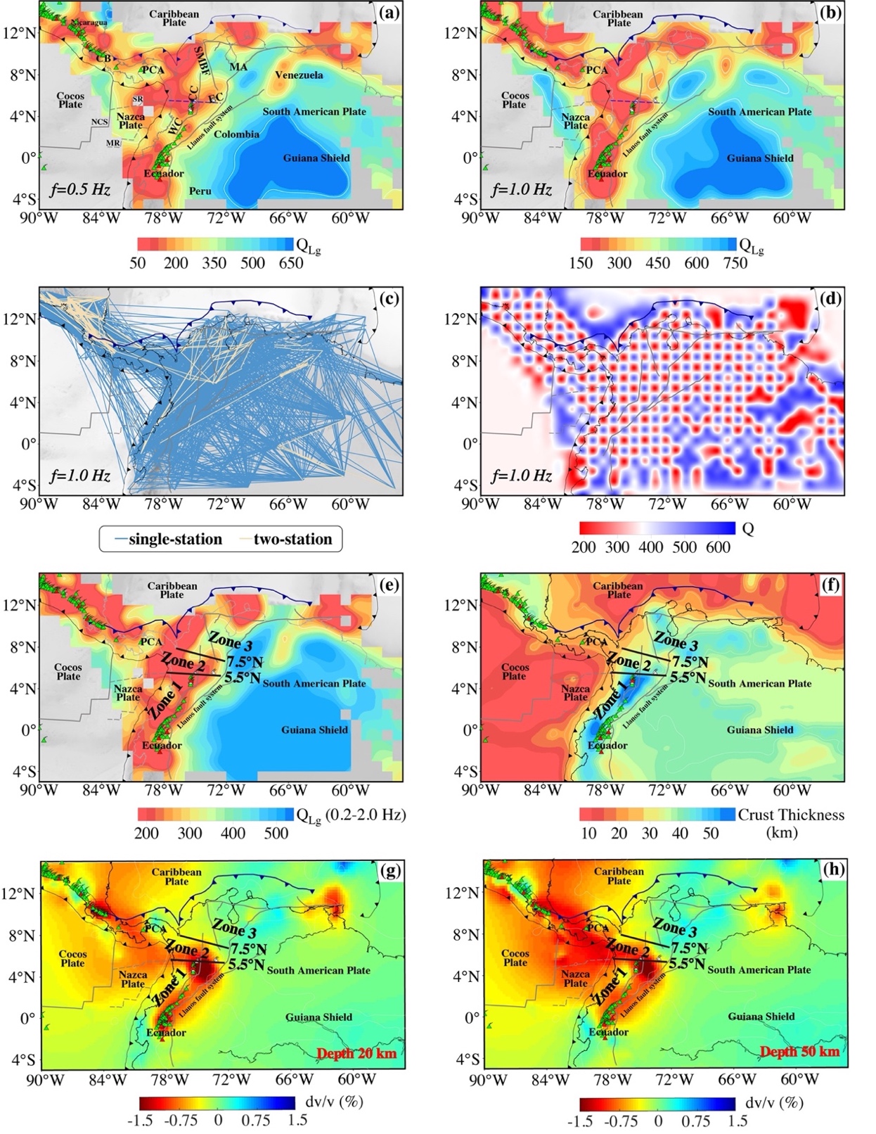 图2 哥伦比亚及其周边地区的地壳Lg波衰减模型、地壳厚度与速度模型之间的对比结果。(a-b) 选取的0.5 Hz与1.0 Hz频率下的地壳QLg分布图;(c-d) 1.0 Hz频率下的射线覆盖与分辨率分析,其中双台与单台射线路径分别为浅黄色和蓝色,棋盘格分辨率测试可达到1°×1°;(e) 0.2-2.0 Hz宽频带QLg分布;(f) 基于CRUST1.0模型 (Laske et al., 2013) 提取的地壳厚度分布;(g-h) 依据MITP_USA_2016MAY模型获得的20公里与50公里深度P波速度扰动横向变化 (Burdick et al., 2017)
