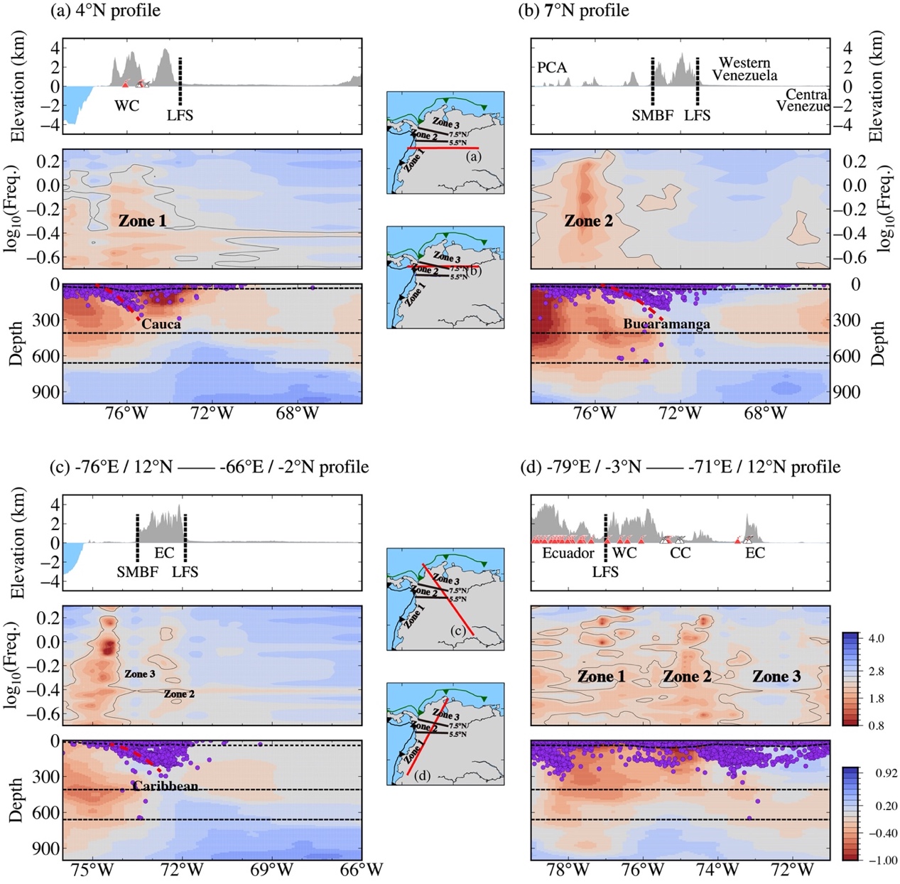 图3 沿四条剖面(a)–(d)的多种地质与地球物理数据对比。剖面位置在插图中以红线标示。每条剖面由上、中、下三个子图组成:顶部显示地表地形与主要断裂位置(垂直虚线);中间展示QLg随频率的变化关系;底部显示P波速度扰动 (Burdick et al., 2017) 及IRIS提供的1900-2023年间震级大于2.0的区域地震活动(紫色圆圈)。黑色虚线标示莫霍面不连续界面及410公里与660公里地幔界面。莫霍面深度提取自CRUST1.0模型 (Laske et al., 2013)。LFS指亚诺斯断裂系统