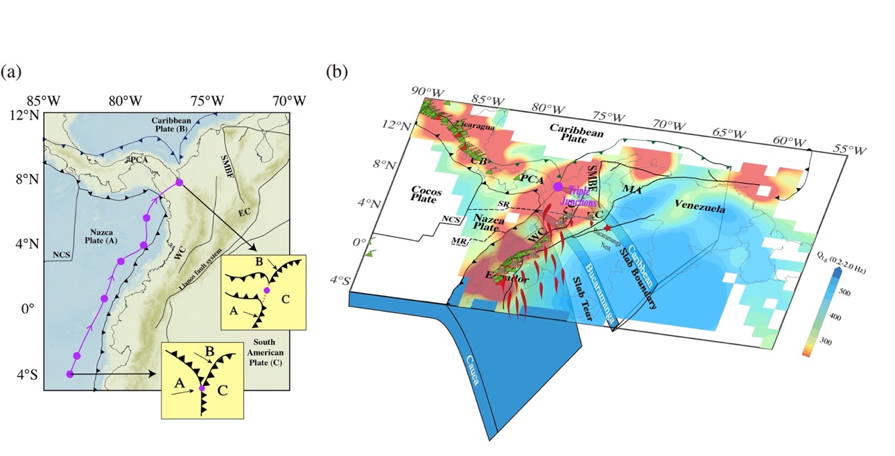 综合Lg衰减、速度结构、地震活动性与构造重建结果,研究推测南美板块下方存在三个俯冲板片(加勒比板片、布卡拉曼加段与考卡段),并将当前纳斯卡—加勒比—南美板块 (NCS) 三联点的位置限定于约7.5°N, 77°W处(图4)。该研究首次通过高分辨率Lg衰减图像揭示了哥伦比亚地区复杂的俯冲系统与三联点构造特征,为理解板块汇聚边界动力学过程提供了重要的地震学约束。