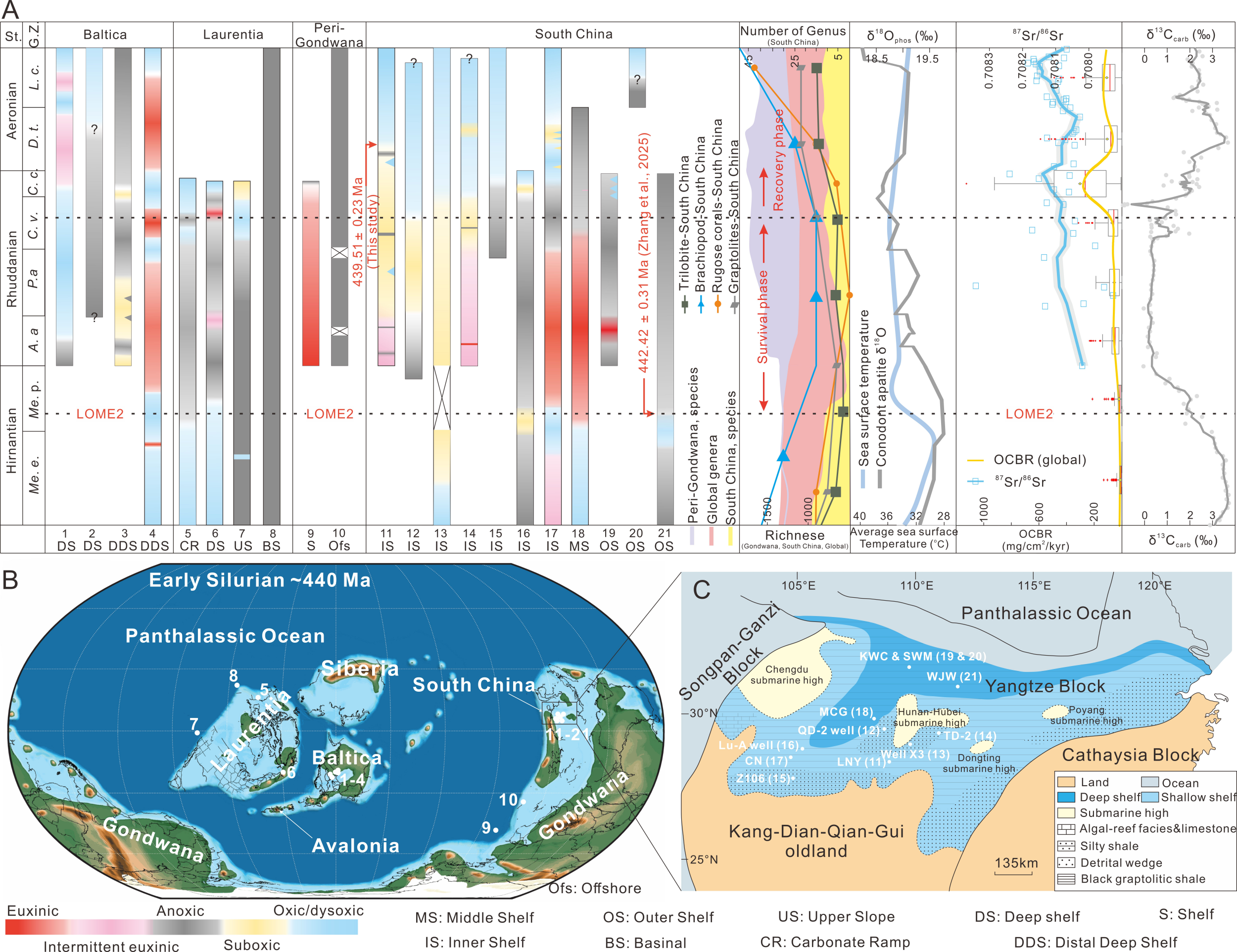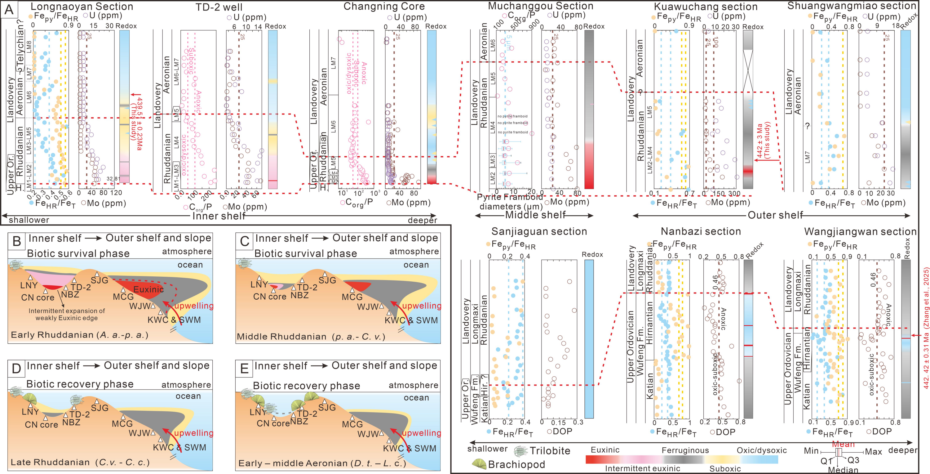 针对上述问题,800彩票李献华院士研究团队,联合多家科研单位通过对扬子地区从内陆架到外陆架的多个剖面进行综合分析,重建了志留纪早期陆架海域的氧化还原时空演化过程。研究结果显示,在晚奥陶世大灭绝之后,华南内陆架海域长期处于低氧甚至缺氧状态,抑制生物的复苏。结合斑脱岩锆石的CA-ID-TIMS U–Pb数据(439.51 ± 0.23 Ma),进一步表明这种还原环境持续了近300万年(图1)。直到鲁丹期晚期,海洋开始逐步氧化,并在埃隆期持续改善,为底栖动物的回归创造了必要条件。相比之下,华南外陆架环境的缺氧状态持续时间更长,直到埃隆期中-晚期才出现明显改善,这一环境转变与部分三叶虫在该时期将生存空间扩展至外陆棚的记录相吻合。