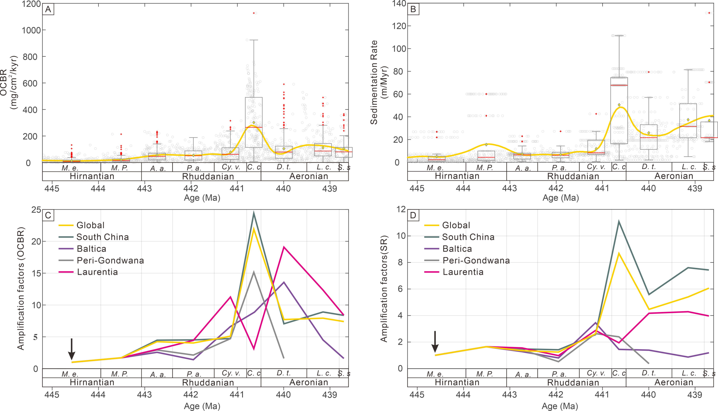 图2 晚奥陶世赫南特期–兰多维列世埃隆期全球有机碳埋藏速率变化