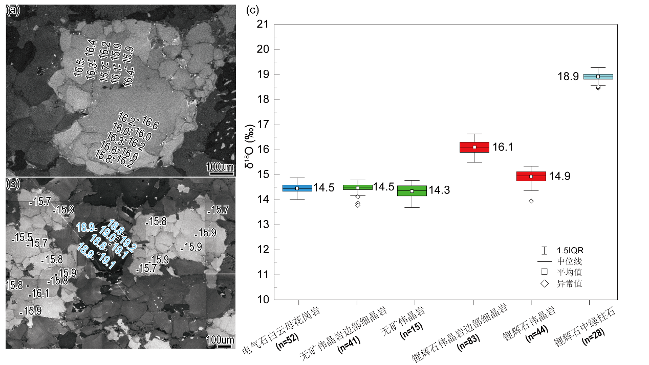 (1)对花岗岩和伟晶岩石英的氧同位素分析显示其变化范围较窄(图2),电气石-白云母花岗岩石英14.0-14.8‰、贫矿伟晶岩及其细晶岩石英13.7-14.8‰、含锂辉石细晶岩石英15.5-16.6‰和核部石英13.9-15.3‰。大部分石英-全岩分馏值(1-2‰)指示处于平衡状态,能够代表岩浆组成。不同岩性石英表现出一致的氧同位素范围,表明它们具有共同的来源;而异常高的δ¹⁸O值则表明琼嘉岗锂辉石伟晶岩的源区可能源自高喜马拉雅变沉积岩的部分熔融作用。