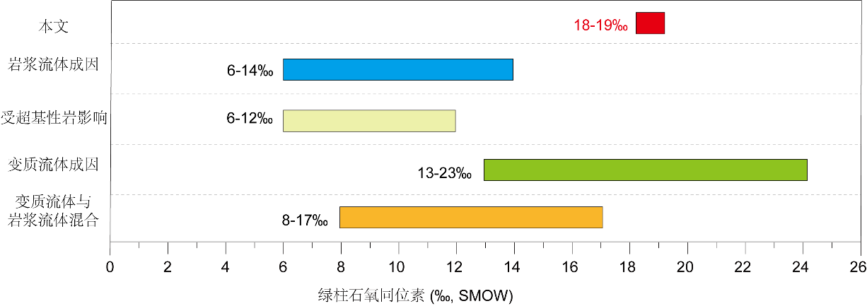 (2)绿柱石的氧同位素分析结果产生了异常高的氧同位素值(18.5-19.3‰)。基于绿柱石-石英之间的同位素平衡分馏公式,石英和绿柱石之间存在明显的同位素不平衡现象。在排除来自源区物质的贡献、大气降水沿藏南拆离系进入体系的影响、大理岩围岩混入的可能性,基于综合收集不同成因绿柱石的氧同位素组成(图3),研究团队倾向认为绿柱石结晶时外部富δ¹⁸O变质流体的加入是造成高δ¹⁸O绿柱石的氧同位素组成的原因。