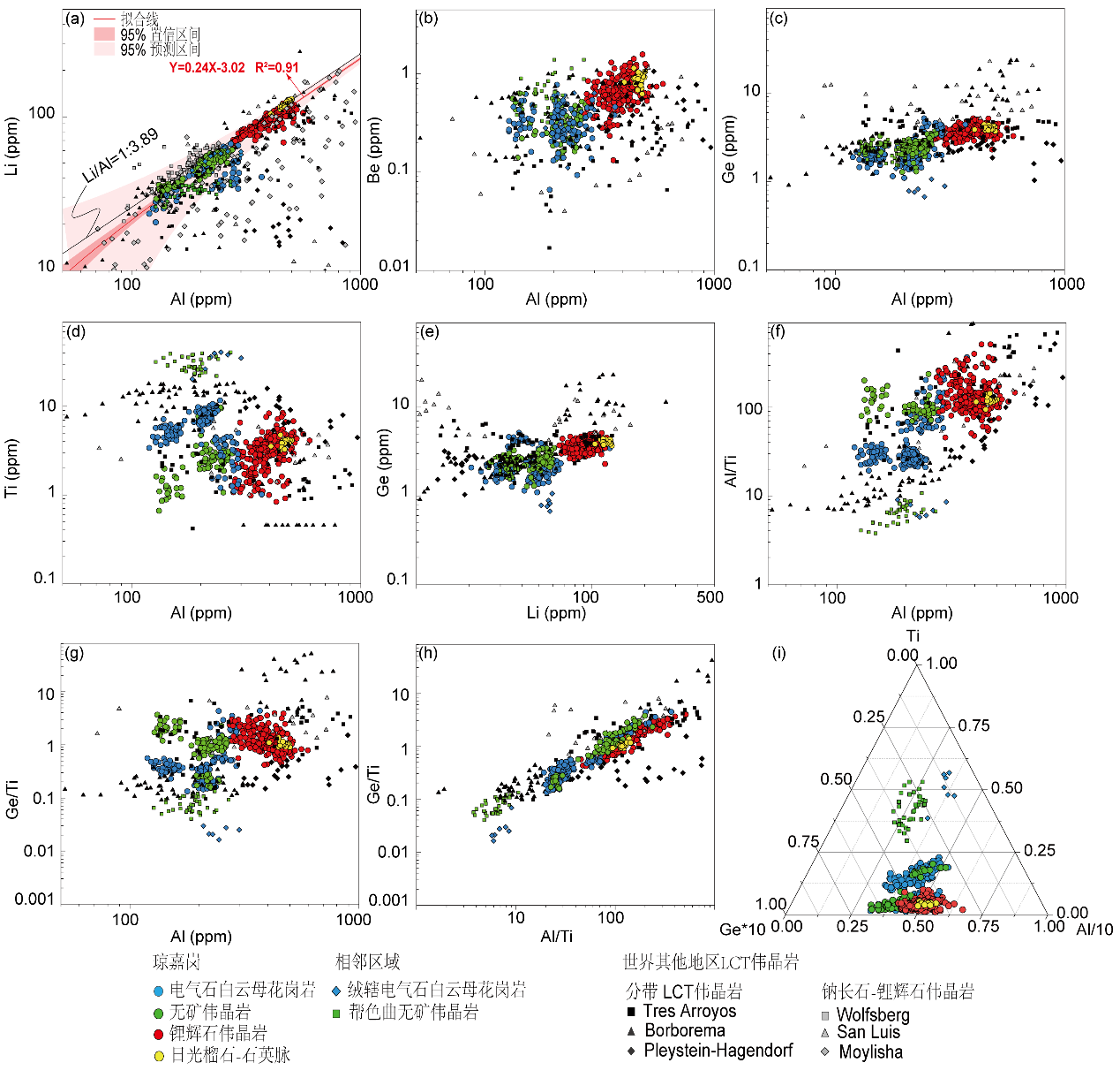 (3)与世界上其他LCT型伟晶岩相比(图4),琼嘉岗电气石白云母花岗岩及锂辉石伟晶岩中石英具有显著强Li-Al相关关系及高Ge/Ti-Al/Ti比值(图4a,h),表明琼嘉岗锂辉石伟晶岩是由高度演化、更富锂的熔体形成。已有的研究表明,在富锂伟晶岩系统中含锂矿物结晶时石英的Li、Al含量最高,演化至热液阶段石英Li和Al含量显著降低;但琼嘉岗地区热液石英(石英+日光榴石脉)同样具有较高Li、Al含量(图4 a,黄色圆圈),表明琼嘉岗锂辉石伟晶岩很可能在结晶的初始阶段达到水饱和,流体出溶发生在其伟晶岩系统演化早期。