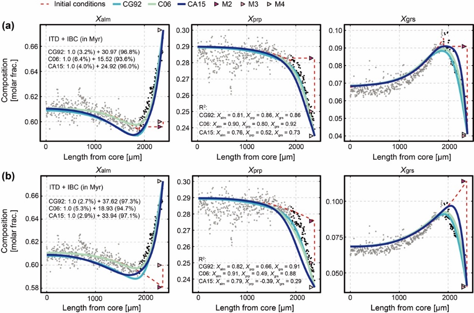 图2 代表性石榴子石的主量元素扩散模拟结果。模拟采用三套实验扩散系数:Chakraborty and Ganguly (1992, CG92)、Carlson (2006, C06) 和 Chu and Ague (2015, CA15)。设计了两类初始条件:(a) 核–幔部为拟合的生长环带,幔–边部为相平衡模拟得到的峰期均一成分;(b) 核–幔部拟合的生长环带延续至颗粒边部。模拟分别测试了不同的近等温降压(ITD)时间尺度(1、2、3、4、5 Myr;图中展示 1 Myr,其余结果见论文附件),并据此反演得到相应的近等压降温(IBC)阶段的时间尺度