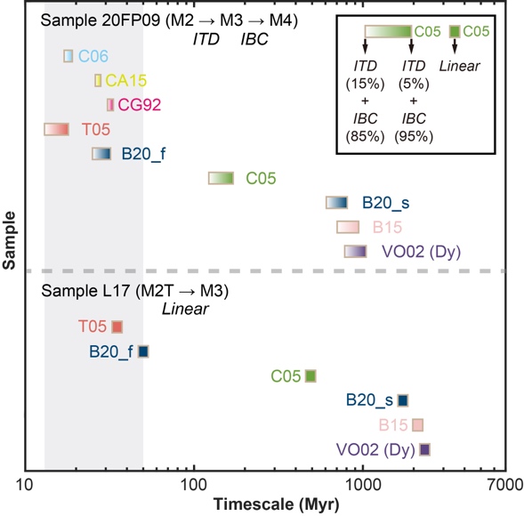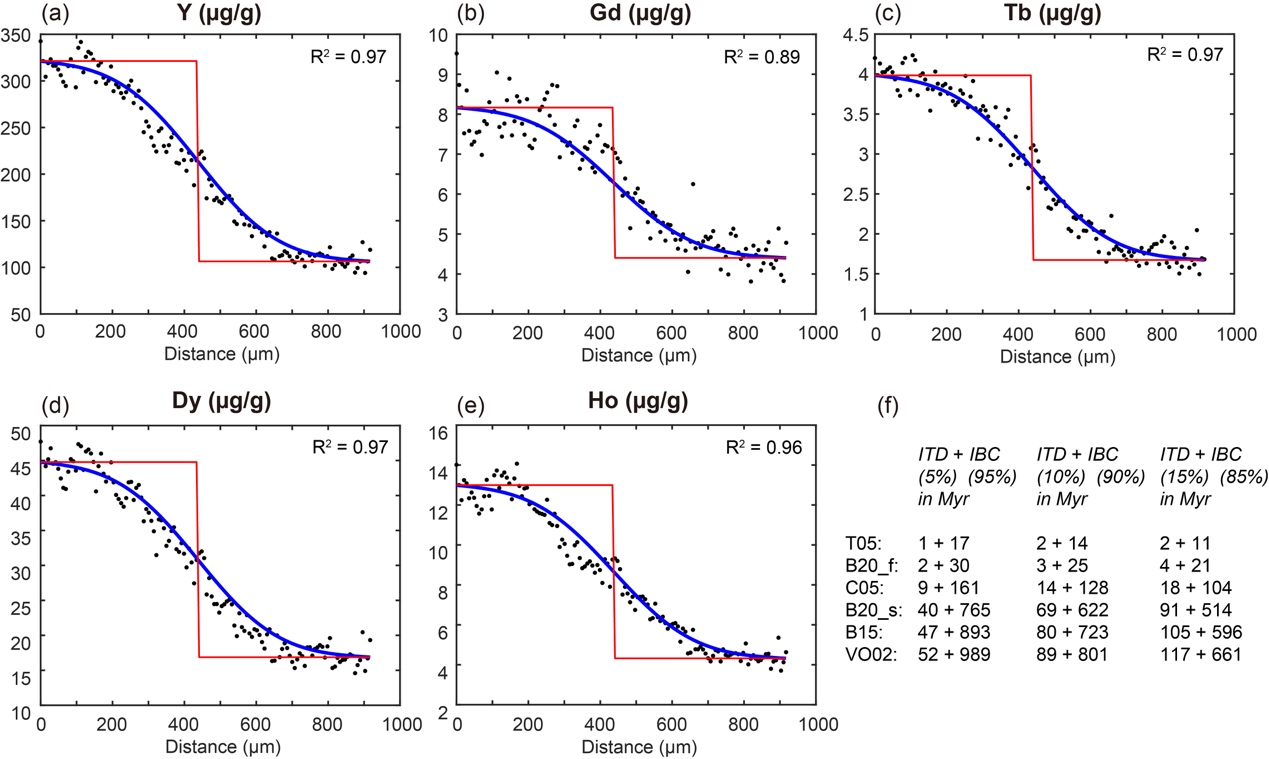 微量元素扩散模拟则采用了6个版本的实验扩散速率(图3),并利用 Zr–P–Cr 这类低扩散速率、保留生长环带信息的元素作为初始剖面参考。模拟结果显示,HREE 在两个样品中均遵循快扩散机制,其扩散行为与主量元素模拟结果高度一致,使得两类独立方法相互验证,显著增强了对冷却时间尺度的约束可靠性。