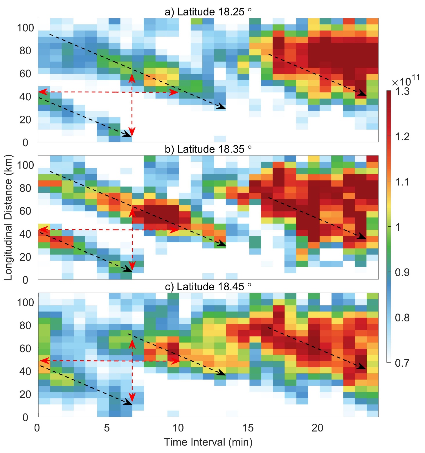 图 2024年9月27日03:45:57(世界时)起,三亚非相干散射雷达在三个不同纬度、同一高度捕获的Es层波动结构的水平漂移;黑色箭头表示Es层随时间变化的运动轨迹,红色双箭头表示波状结构的水平波长和周期