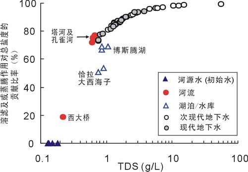 溶滤、蒸发、蒸腾是自然水体盐化的主要原因。但是,如何定量评价水体盐化过程中各种作用的贡献比例,目前尚无简单而又可靠的方法。由于蒸发伴随着浓缩,造成水体中氢氧稳定同位素的富集,前人利用δ18O或δ2H与 TDS的关系确定蒸发浓缩的作用,如Simpson等根据埃及的...