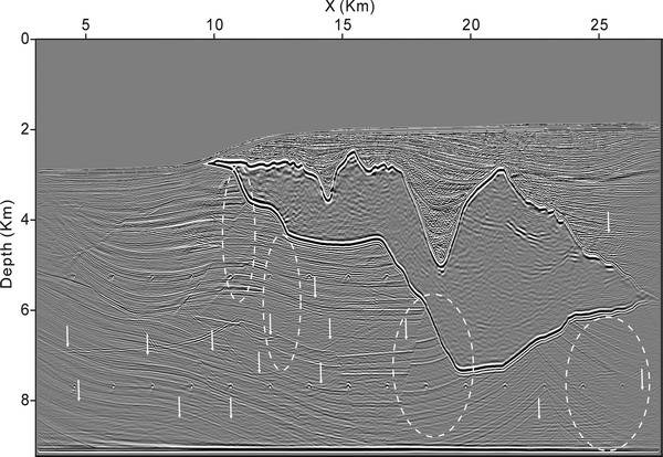 附图说明:Sigsbee2B多次波逆时偏移成像 盐丘(subsalt)是地下的高速体,分布广泛,可达几千米到上万米深。盐丘下部是油气藏主要聚集地,深海大型油气田大部分含有盐丘构造。确定盐丘下部断层、圈闭、边界是寻找大型油气田的前提。由于盐丘下部构造非常复杂,地震...