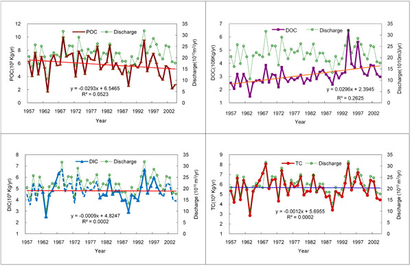 图1 西江河流颗粒有机碳(a),溶解有机碳(b),溶解无机碳(c)及总碳(d)长期变化趋势 河流是连接地球上两个重要碳库——海洋和陆地生态系统的重要通道, 流域发生的许多自然过程都反映在河流输出碳及其生物地球化学的性质上。通过对河流生物地球化学的研究,探...